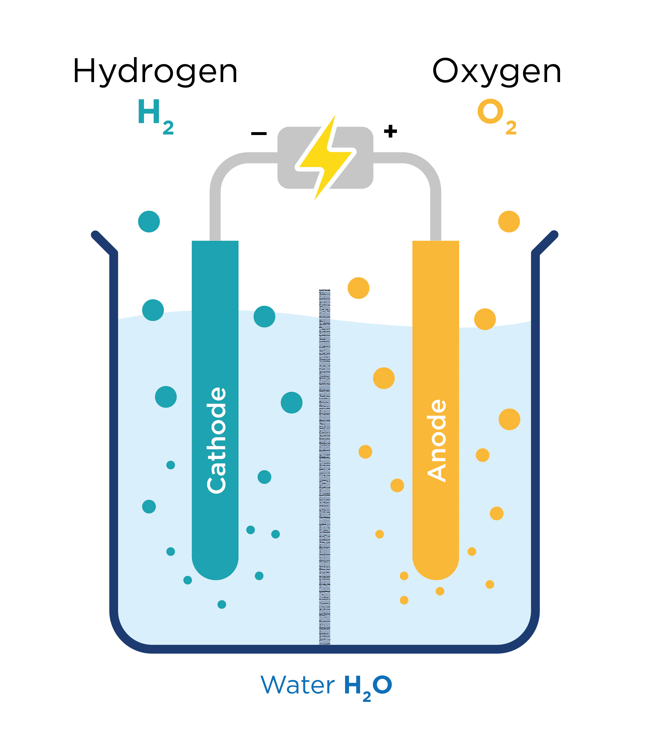 Before we look at the last two types of hydrogen, we need to explore a technique called electrolysis, which is a method used to generate both types. Electrolysis is the process of using electricity to split water into hydrogen and oxygen. This reaction takes place in a unit called an electrolyser.