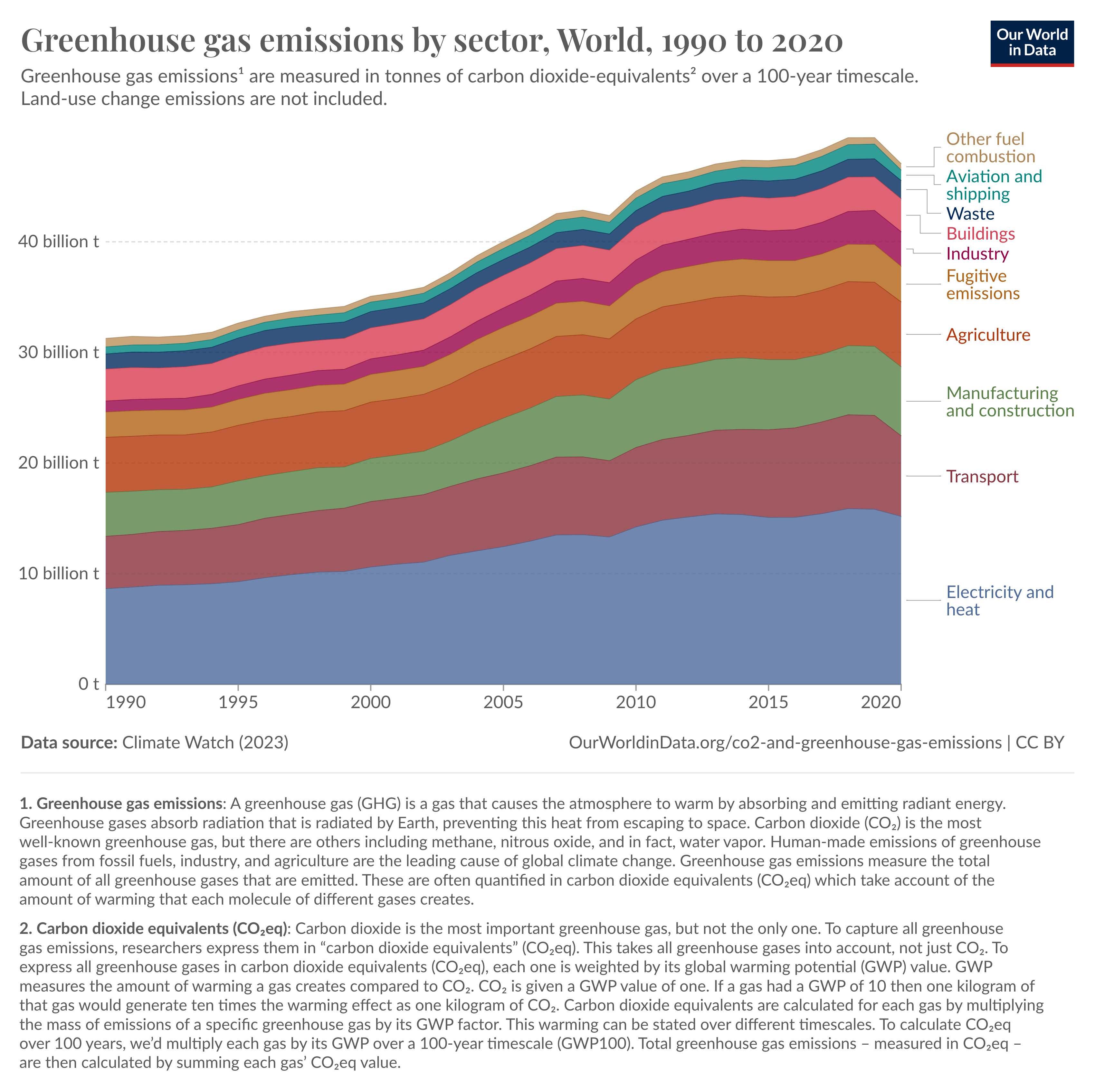 As of 2020, the sectors that contributed the most to global emissions were Electricity and Heat at 15.18 billion tonnes, Transport at 7.29 billion tonnes and Manufacturing and construction at 6.22 billion tonnes (Ritchie et al., 2020).